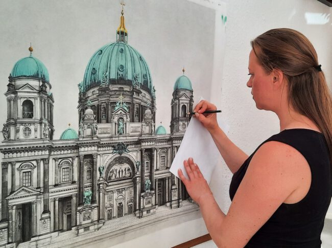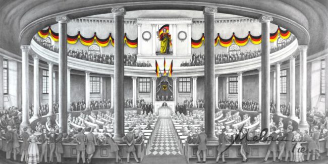 Bildnerische Kunst von Melanie Tietjen 7 Zeichnungen zur Deutschen Geschichte Klassische Bleistiftzeichnung triff farbige Akzente mit Acryl Jede Zeichnungen hat ein Maß von 1×2 Meter Vor Projektbeginn habe ich für jedes Motiv nach Wunschvorstellungen auf einem kleinen Papier skizziert. Meine Skizzen zeigen nicht alle Details. Sie dienen meisten nur für den ersten Eindruck vom Gesamtmotiv. Zu Anfang gab es auch die Idee das Motiv zur Paulskirchenversammlung im Hochformat. Einheitlich blieb es beim Querformat. Die Bearbeitungszeit lag bei einem Jahr. Ich bin dankbar, stolz auf mich zurückblicken zu dürfen 1813-1815 Theodor Körner und das Lützowsche Freikorps Bei der Reihenfolge hielt ich mich zurnächst an die Ereignisjahre und fing mit dem Motiv „Theodor Körner und das Lützowsche Freikorps“ 1813-1815 an. Vorlage für die Kulisse war der Schneckenberg mit Eiche um die sich die Lützower Jäger um den Schriftsteller versammelten. Inmitten der Infanterie befindet sich auch Eleonore Prochaska. Bei der Uniform hielt ich mich an das 1. Rheinische Infanterie-Regiment „von Lützow“ Nr. 25. Farblicher Akzent „Theodor Körner“ 1817 Studentenzug zum Wartburgfest in Eisenach Mit der Vorliebe für kleine Details waren für mich neben den Uniformen der Studenten deren Instrumente, die Kinder und Menschen abseits, sehr interessant. Nicht zu übersehen der Bauer in der Ferne. Nach dem Einfärben der damaligen Fahne der Urburschenschaft mit Eichenlaub kam eine kleine Herausforderung der zusätzlichen Integrierung vier Herren, die ich doch sehr gut gemeistert habe. Farblicher Akzent „Deutschland Fahne mit Eichenlaub“ 1813-1815 Theodor Körner und das Lützowsche Freikorps 1817 Studentenzug zum Wartburgfest in Eisenach 27. bis 30. Mai 1832 Das Hambacher Fest 1848 Nationalversammlung in der Paulskirche Frankfurt 1871 Reichsgründung – Proklamation Otto von Bismarck 1919 Weimarer Versammlung vor dem Nationaltheater 1990 Wiedervereinigung vor dem Bundestagsgebäude in Berlin KONTAKTIER MICH FOLGE MIR